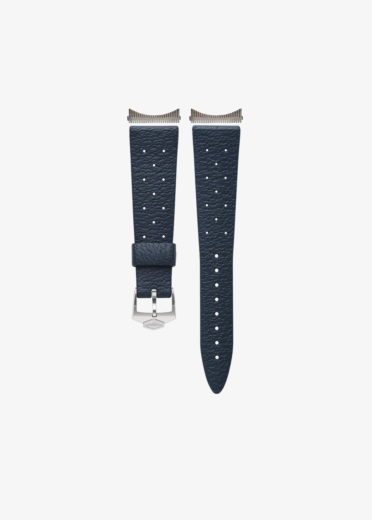 Die Dornschließe aus Stahl kombiniert gebürstete Oberflächen mit polierten Fasen. Das erhabene SERICA-Logo, das den Berggipfel und seine Spiegelung im Wasser darstellt, ist ebenfalls poliert und sitzt auf einem fein mikrokugelgestrahlten Hintergrund.