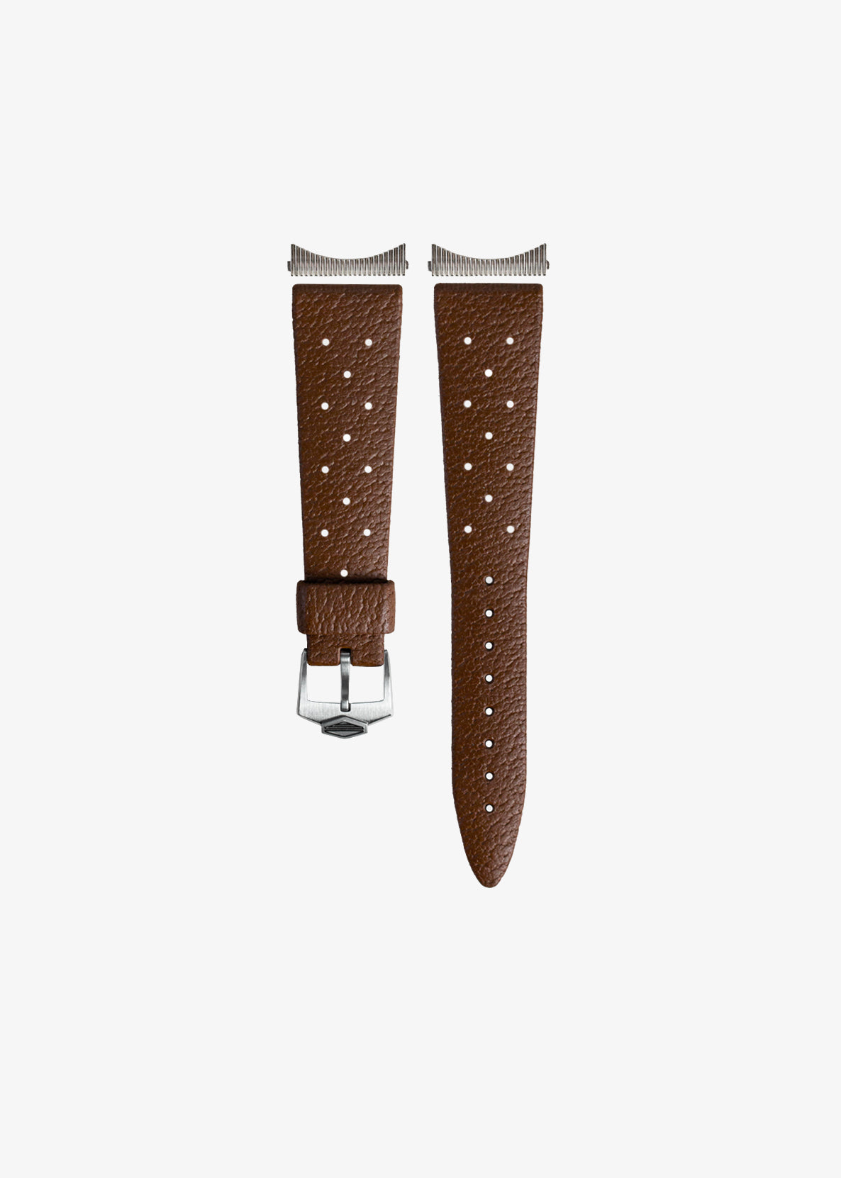 Die Dornschließe aus Stahl kombiniert gebürstete Oberflächen mit polierten Fasen. Das erhabene SERICA-Logo, das den Berggipfel und seine Spiegelung im Wasser darstellt, ist ebenfalls poliert und sitzt auf einem fein mikrokugelgestrahlten Hintergrund.