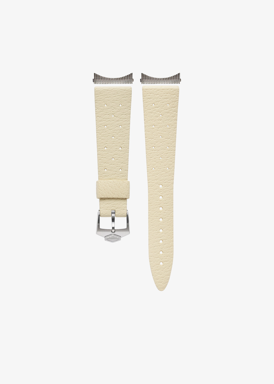 Die Dornschließe aus Stahl kombiniert gebürstete Oberflächen mit polierten Fasen. Das erhabene SERICA-Logo, das den Berggipfel und seine Spiegelung im Wasser darstellt, ist ebenfalls poliert und sitzt auf einem fein mikrokugelgestrahlten Hintergrund.
