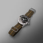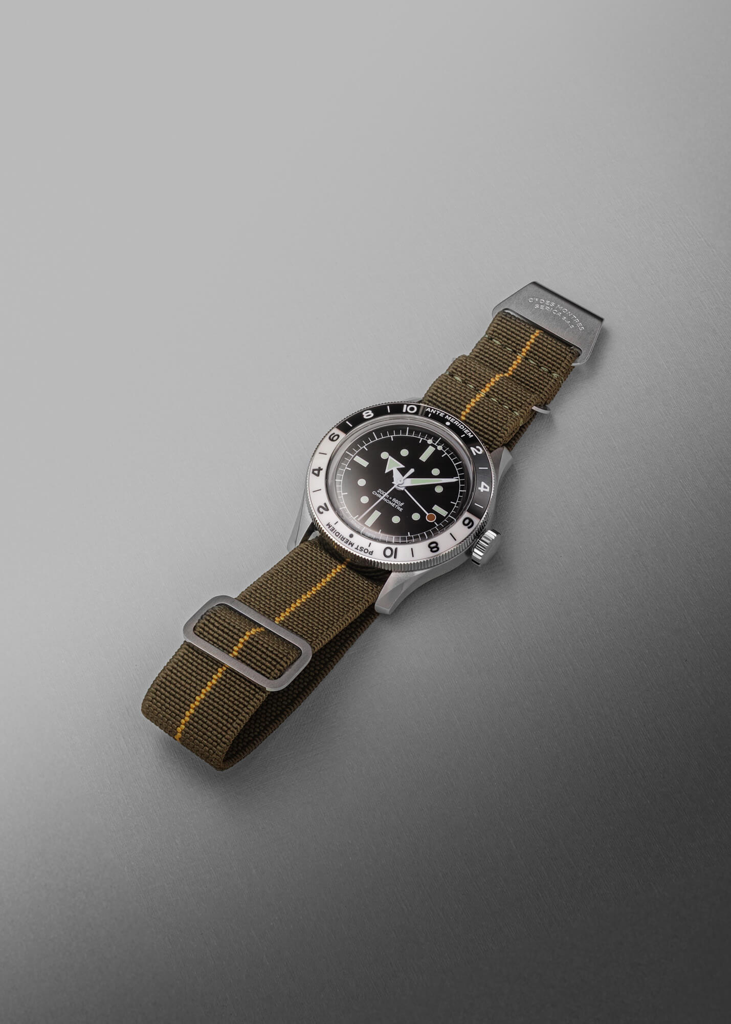 Inspired by the design and materials of vintage parachute straps, the dense-weave stretch nylon ensures a secure fit on the wrist and outstanding wearing comfort.
