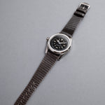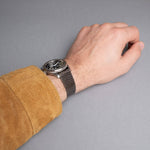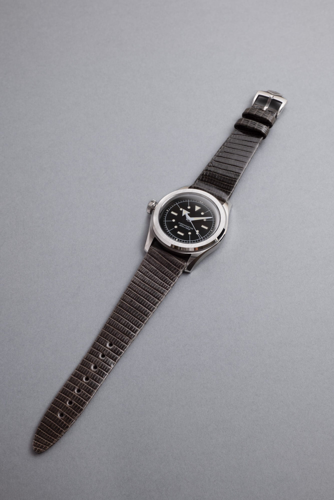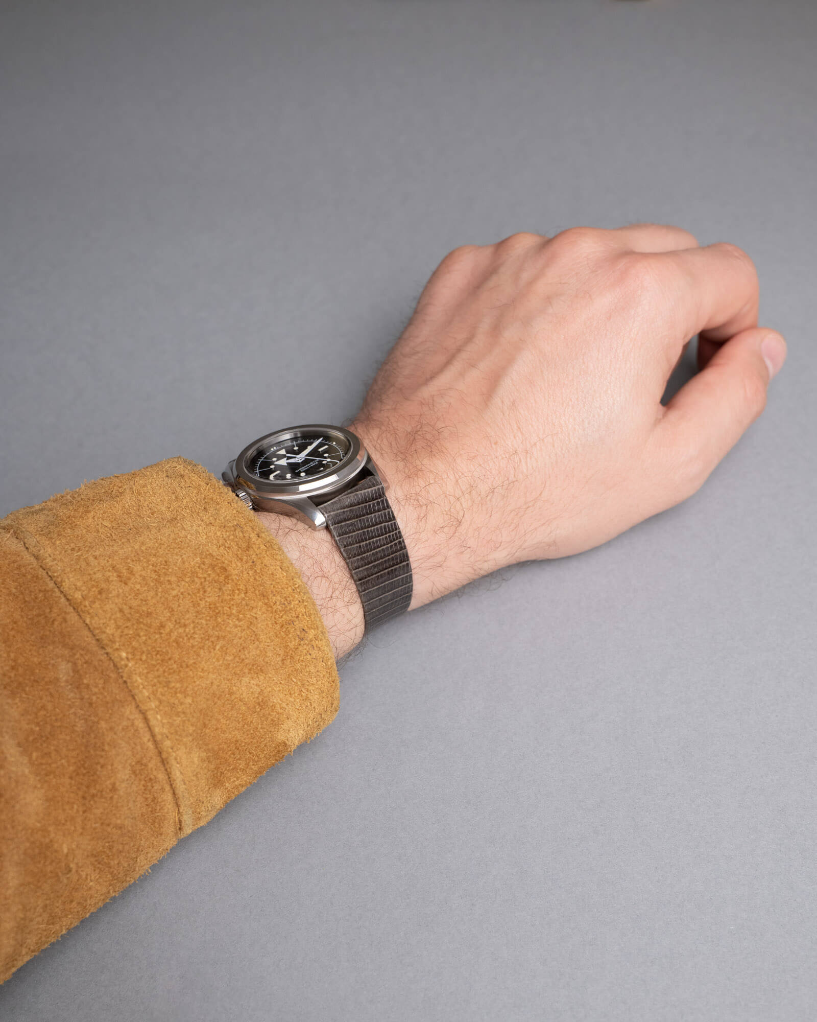 La hebilla tipo ardillón ‘Parade’ retoma los códigos estéticos del bisel ‘Stadium’ de la Ref. 1174, con su superficie cepillada verticalmente y sus chaflanes pulidos. Fabricada en acero, alterna acabados cepillados y detalles pulidos, con el logotipo SERICA en relieve que representa una cima y su reflejo en el agua pulido sobre un fondo finamente microgranulado.