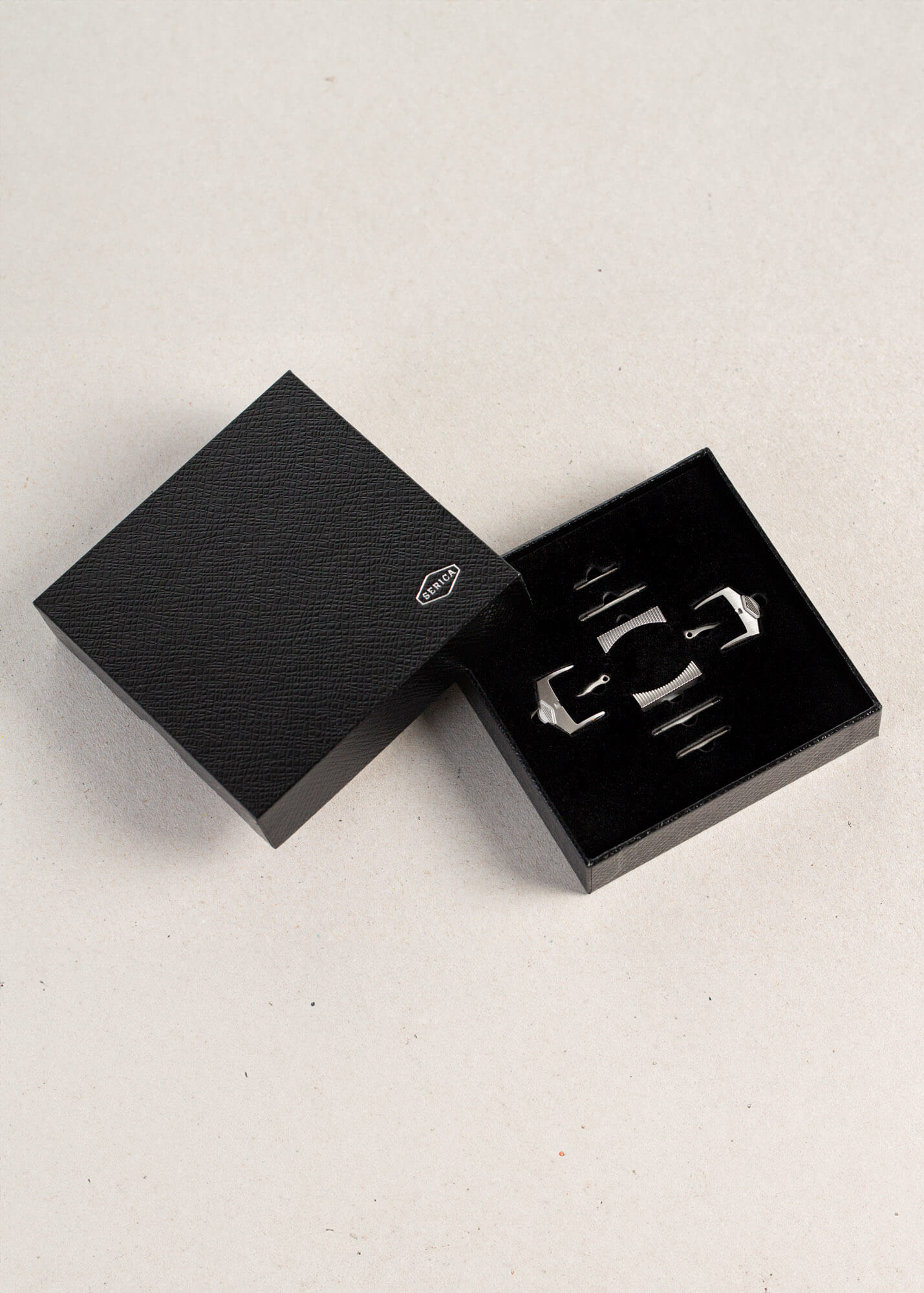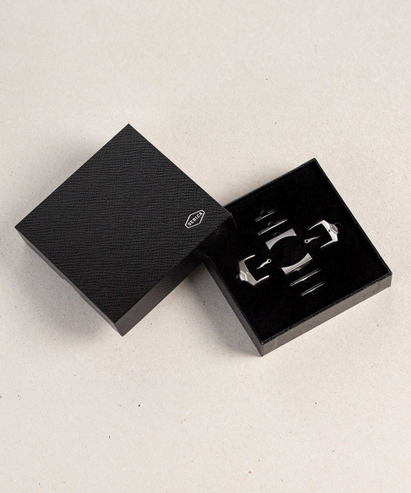 La hebilla ardillón de acero Serica es la firma de su reloj. Diseñada con el mismo nivel de exigencia y acabados que nuestras cajas, retoma la forma de nuestro logotipo.