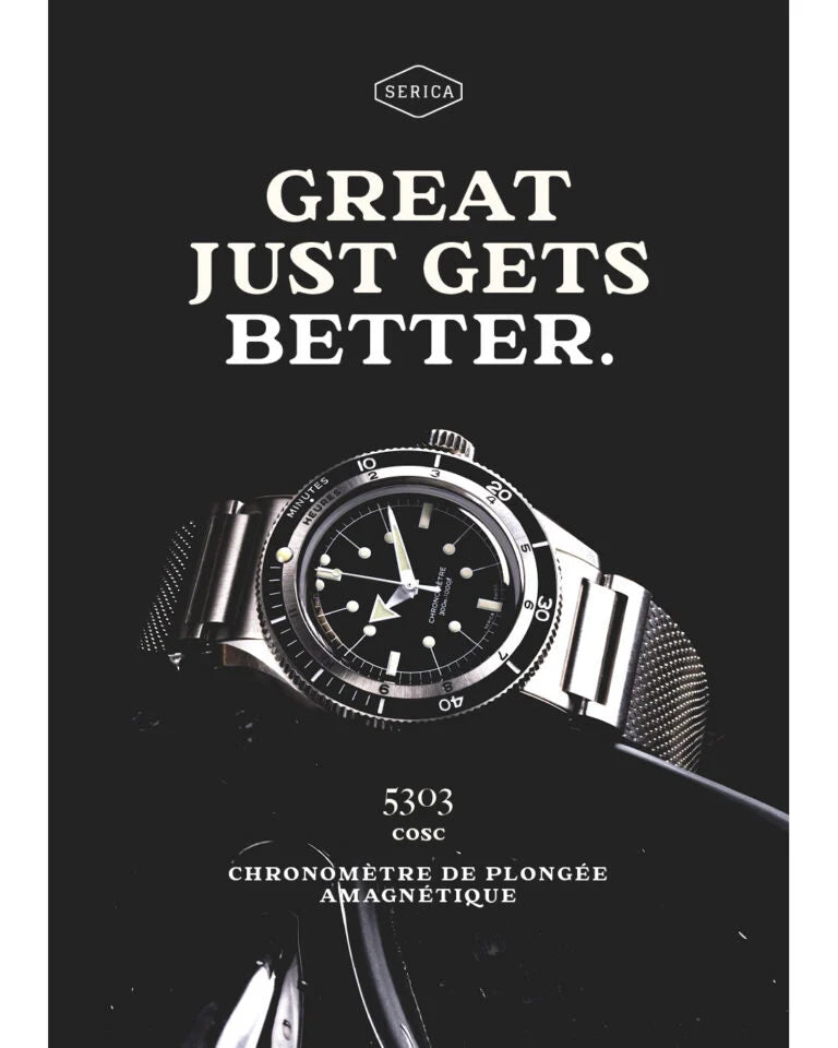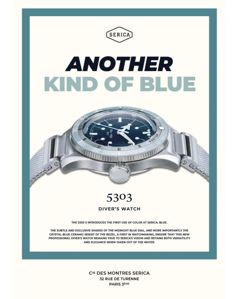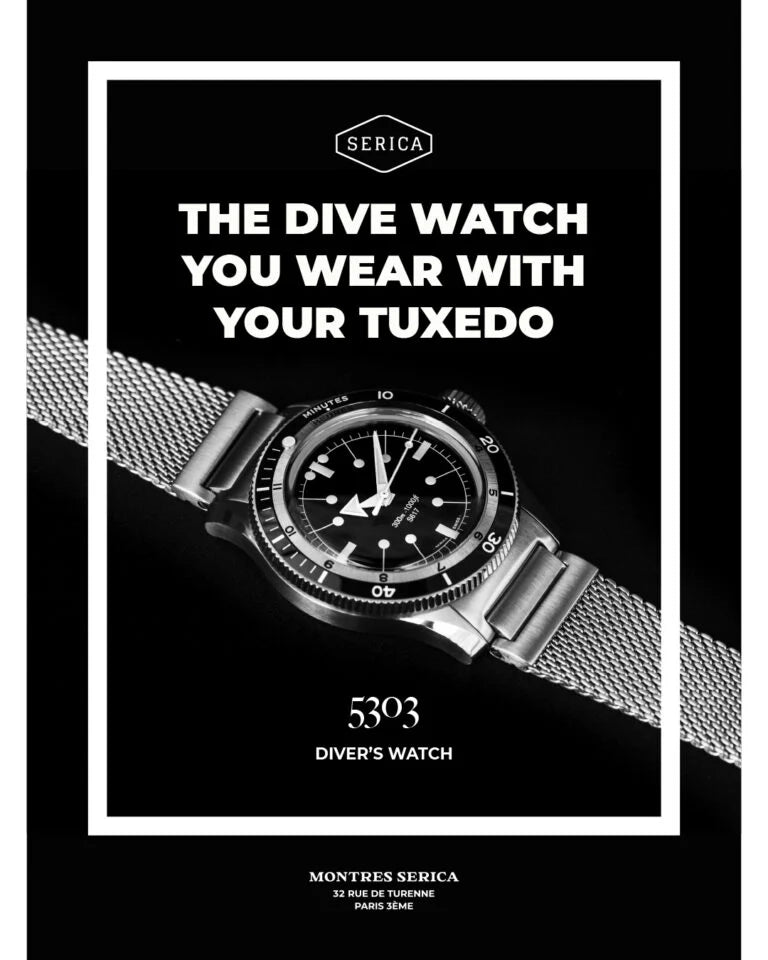 SERICA presenta il suo orologio subacqueo, il modello 5303: un design potente e singolare intriso di grande eleganza, che introduce per la prima volta una scala a doppio materiale che combina ore e minuti.