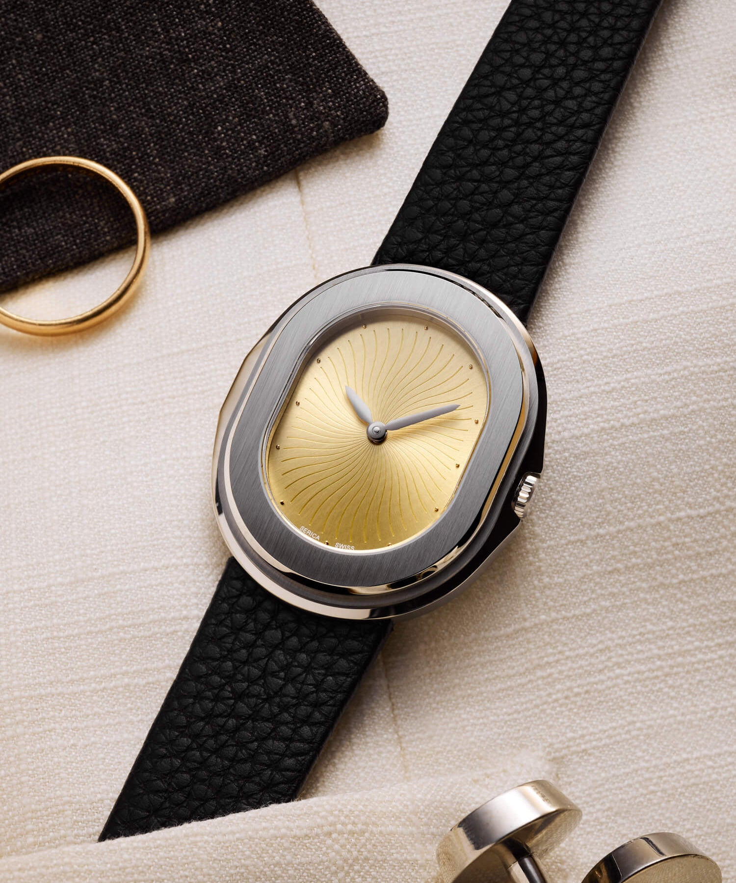 L’ellisse matematica, con i fianchi rettilinei, dolce e decisamente moderna, incarna oggi la nostra eleganza con unicità. Al contempo organica e strutturata, si riconosce al primo sguardo.