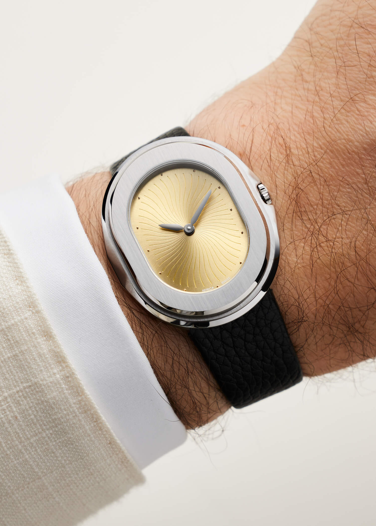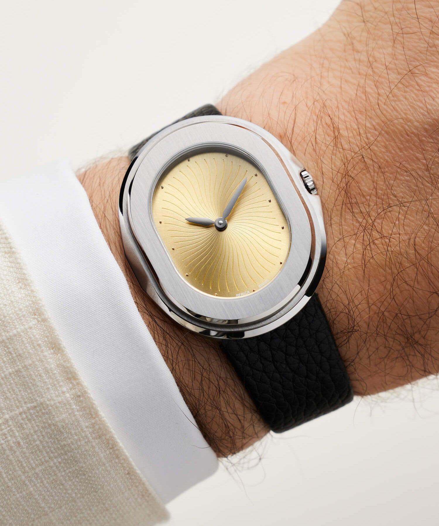 Il quadrante del modello 1174 combina una finitura soleil con un particolare guilloché radiale composto da 48 curve a S. Gli indici delle ore sono costituiti da dodici mezze sfere lucide e applicate a mano, pensate per guidare lo sguardo e permettere una lettura immediata di ore e minuti senza mai alterare la purezza del disegno.
