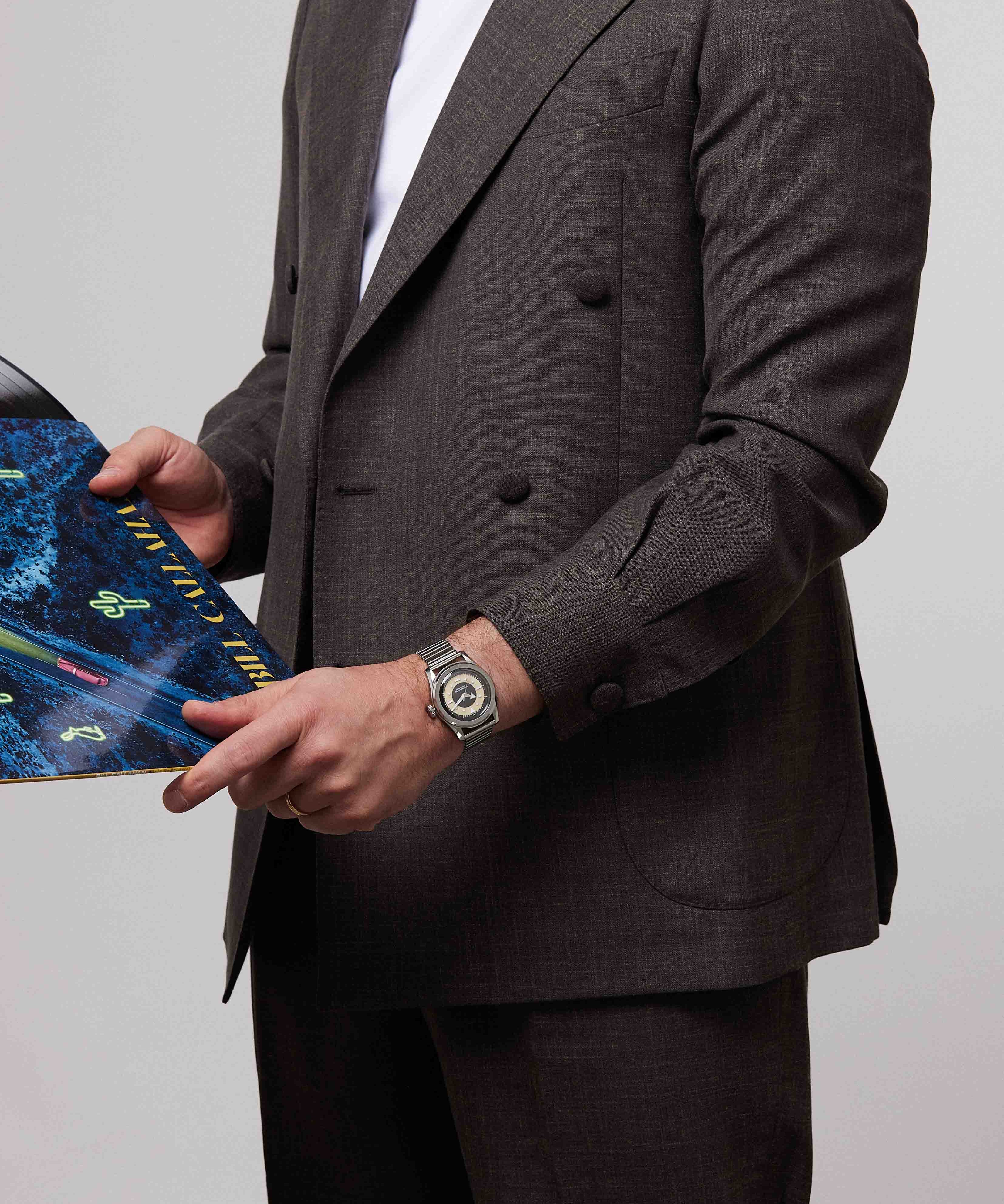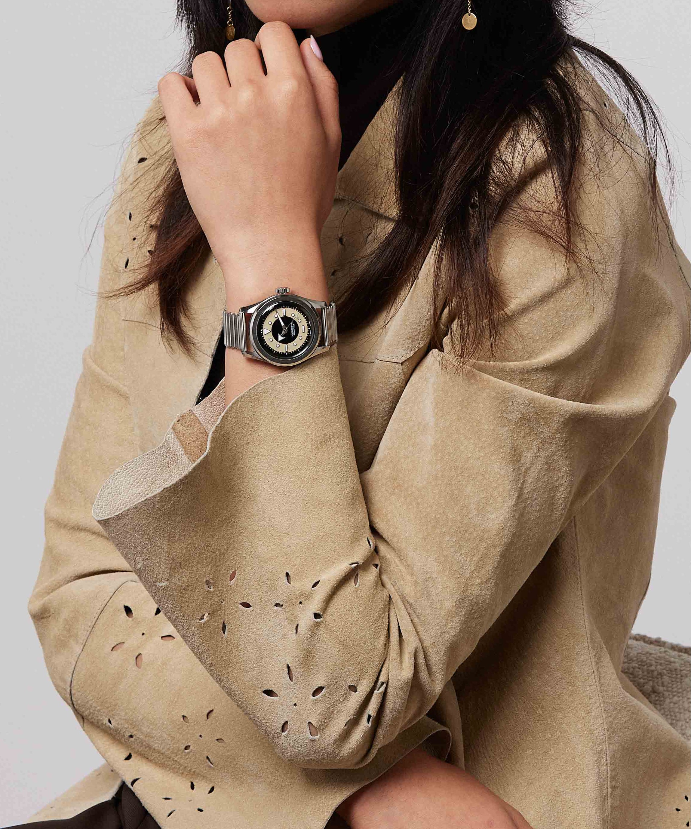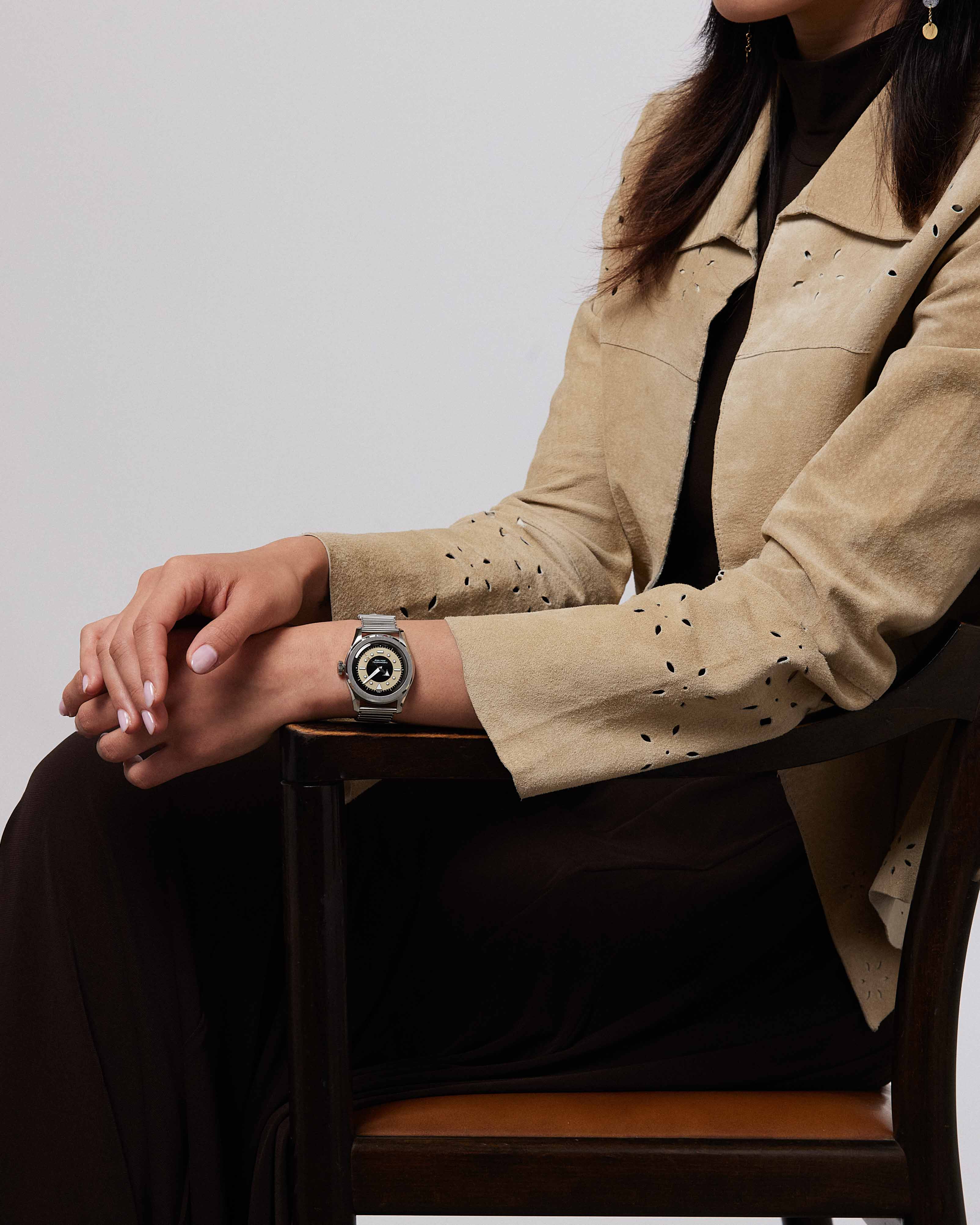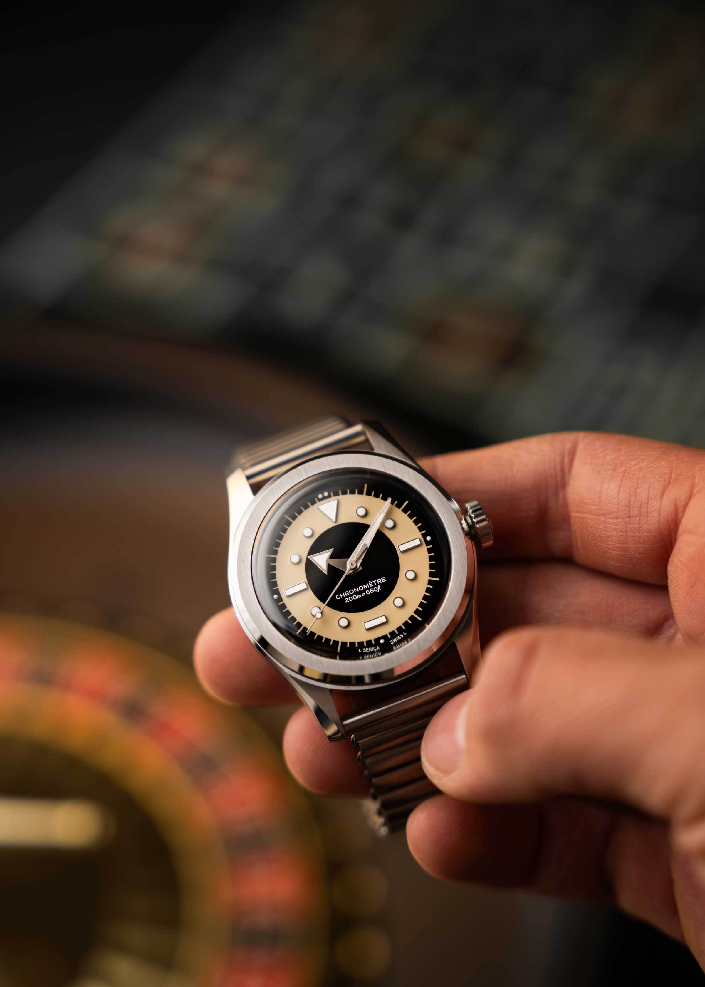 Cette nouvelle interprétation du cadran bi-ton, faisant apparaître une troisième couleur sur le secteur central offre un contraste fort et une parfaite lisibilité, sans jamais recourir à l’utilisation d’une patine artificielle, réaffirmant ainsi notre engagement envers une horlogerie résolument moderne.